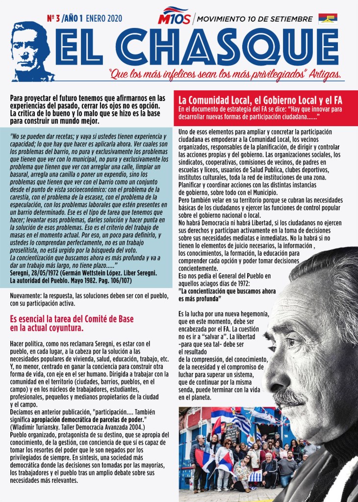 La batalla ideológica, política y económica es un imperativo del momento. Invitamos a participar y aportar al debate que se debe la Izquierda en Uruguay. La Estrategia y un Programa que tenga como eje al 90%: limitar la acumulación de capital, al tiempo que promueve la propiedad y la gestión social. A través de El Chasque queremos aportar a esta batalla, con las herramientas de la crítica y la autocrítica, la idea que los cambios sólo son posibles con la participación protagónica de trabajadores y pueblo. Ponerlo todo en duda, si, también. Pero con la certeza que el capitalismo no es una salida para la humanidad.
