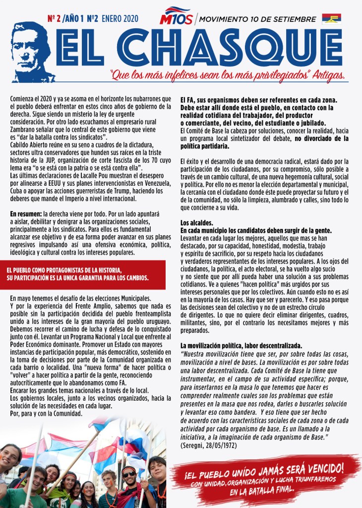 La batalla ideológica, política y económica es un imperativo del momento. Invitamos a participar y aportar al debate que se debe la Izquierda en Uruguay. La Estrategia y un Programa que tenga como eje al 90%: limitar la acumulación de capital, al tiempo que promueve la propiedad y la gestión social. A través de El Chasque queremos aportar a esta batalla, con las herramientas de la crítica y la autocrítica, la idea que los cambios sólo son posibles con la participación protagónica de trabajadores y pueblo. Ponerlo todo en duda, si, también. Pero con la certeza que el capitalismo no es una salida para la humanidad.