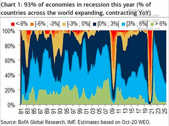 Por supuesto, podíamos predecir que se avecinaba una pandemia, pero no prever cuándo y dónde surgiría el COVID-19. La pandemia de COVID eliminó todas las previsiones anteriores. Ahora, cuando miramos hacia atrás en 2020, la economía capitalista mundial ha registrado la depresión más grande y más amplia de su historia, cerca del 95% de las economías sufre una contracción en la producción nacional, la inversión, el empleo y el comercio.