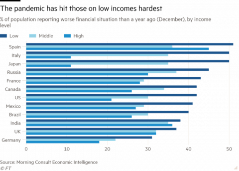De hecho, existe un riesgo real de que se produzca una tercera ola en la crisis pandémica. La caída comenzó con lo que podríamos llamar un ‘shock de oferta’, ya que las empresas cerraron, los viajes se detuvieron, la gente se quedó en casa y las industrias del sector de servicios se paralizaron. Luego se convirtió en un «shock de demanda» al caer en picado el gasto en servicios, ocio, viajes y otros productos «innecesarios». Los ingresos de los trabajadores profesionales y de oficina mejor pagados que podían trabajar desde casa se mantuvieron altos, mientras que los trabajadores no cualificados y con salarios más bajos que tenían que salir a trabajar vieron desaparecer sus puestos de trabajo. Hasta el 40 por ciento de las personas en los estratos de ingresos más altos de las principales economías pudieron trabajar desde casa durante la pandemia, más del doble de la proporción que entre las personas con ingresos más bajos. Los primeros no gastaron, por lo que las tasas de ahorro se dispararon.