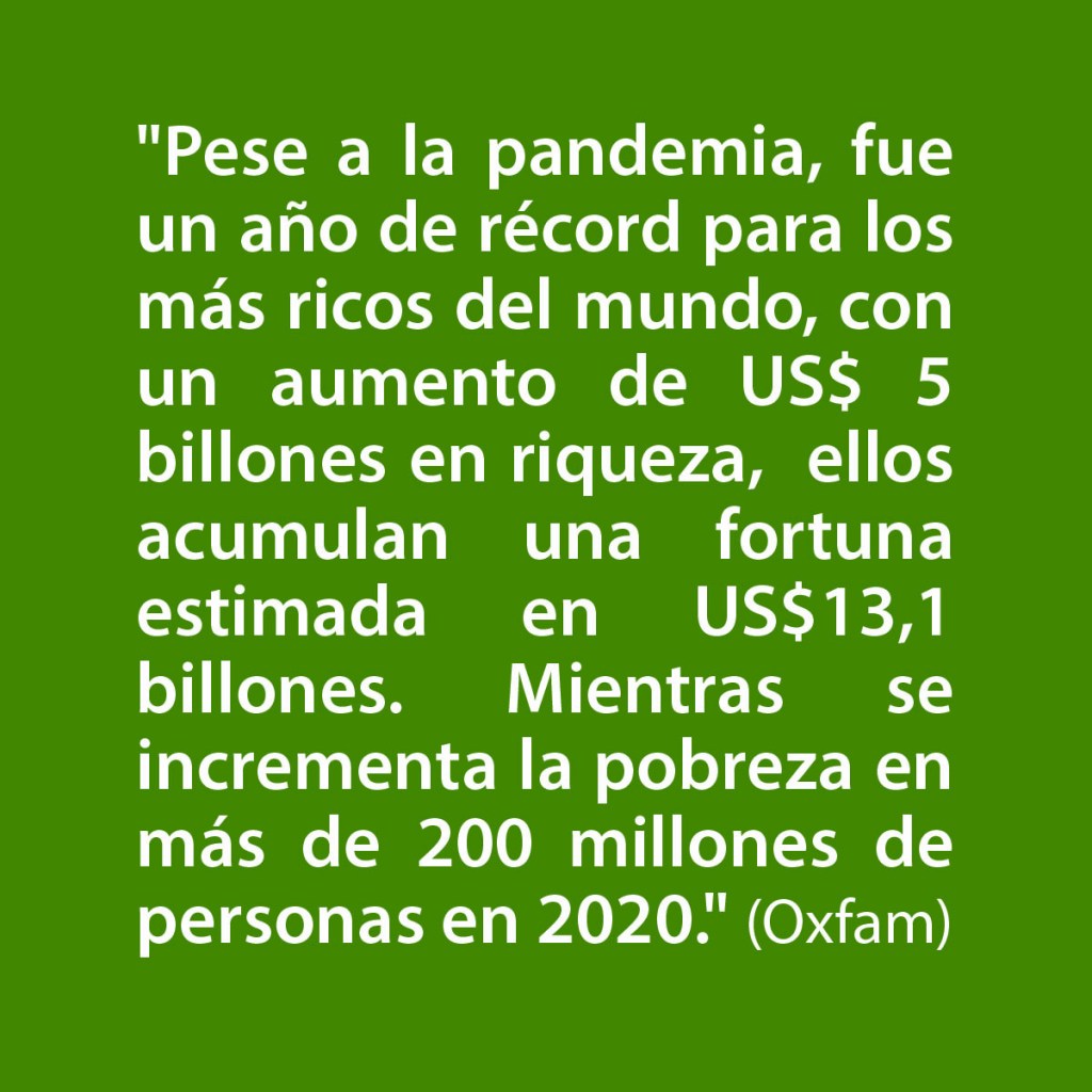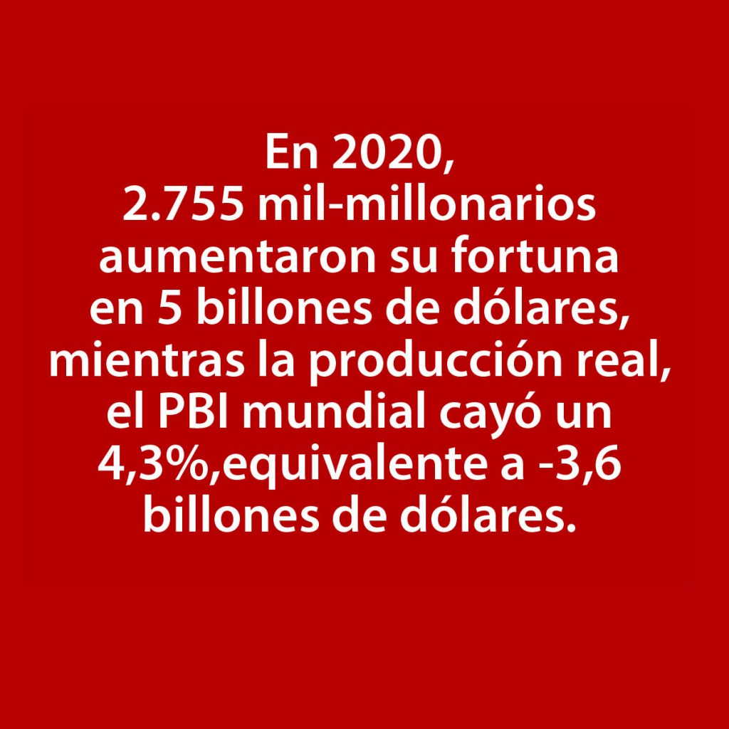 Hoy la financiarización en el mundo, la concentración de capital, la multiplicación de la miseria y la pobreza no tienen límites. A más de un año de la peor pandemia que ha asolado al mundo, las ganancias y la riqueza de los más ricos aumenta sin cesar por miles de millones de dólares, mientras la crisis sanitaria y económica sume aún más en la pobreza a cientos de millones de personas.