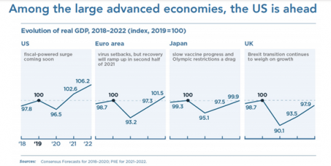 Estados Unidos, junto con China, es uno de los países que parece recuperarse más rápidamente. Eso se debe en parte a los grandes paquetes fiscales de la administración Biden, que han reducido las pérdidas de ingresos y proporcionado dinero a las empresas. Sin embargo, la gran pregunta es hasta que punto será eficaz y sostenible esta política económica.