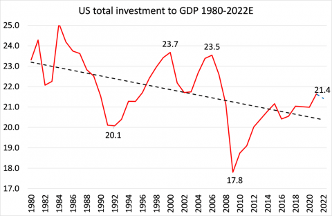 Por el momento, el sector capitalista invierte alrededor del 15 por ciento del PIB productivamente, es decir, no en propiedad inmobiliaria (4-5%) y especulación financiera. Por el contrario, la inversión pública es baja: contribuye solo el 3 por ciento del PIB al año a la inversión productiva, y los paquetes de Biden aumentarán eso en solo un 0,5 por ciento, como se indicó anteriormente.