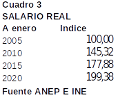 Finalmente en este capítulo el cuadro 3 nos trae la evolución del salario real que se multiplicó por dos en este periodo.