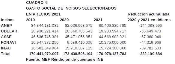 El cuadro 4 nos trae los datos de algunos incisos claves en el gasto social.