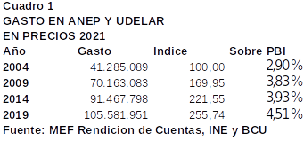 El cuadro 1 nos muestra que desde 2005 a 2019 (tomamos solo los años finales de cada gobierno) el gasto de la ANEP y la UDELAR se multiplicó por dos veces y media y en términos de su participación en el PBI pasó de 2,9% a 4,5%.