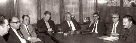 Héctor Rodríguez (CNT), Oscar Maggiolo (Universidad), Sebastián Elizeire (PDC), Daniel Sosa Díaz (PDC), Gerardo Cuesta (CNT), Juan Pablo Terra (PDC), José Luis Massera (PCU) y Vladimir Turiansky (CNT). Reunión de la Comisión Provisoria del Movimiento en Defensa de las Libertades,realizada el jueves 21 de marzo de 1968,en el Rectorado de la Universidad de la República. (foto Centro Fotografía Montevideo)