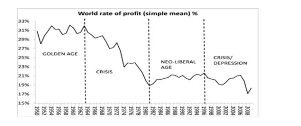 Claro que si contamos sólo las economías de capitalismo avanzado ese descenso es aún mayor. Así, por ejemplo, la tasa de ganancia industrial en Japón pasó de 31,6 entre 1955-59, a 14,5 entre 1991 2000; y en Alemania cayó de 30,3 entre 1949-59 a sólo 5,2 entre 1991-2000. En EE.UU. lo hizo de 25 a 17,7 para esas mismas fechas (Brenner, 2009), y en el año 2000 todavía era la mitad de la de 1948 (Dumènil y Lévy, en Roberts, 2017).