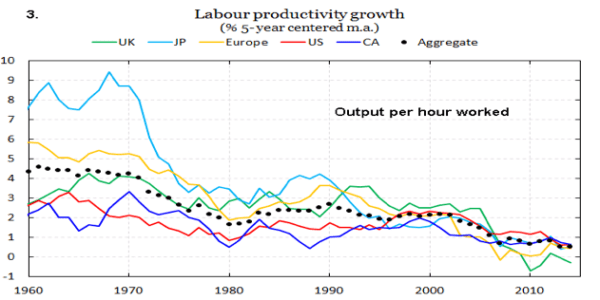 El Citi Global Perspectives & Solutions (2016) indica cómo el crecimiento de la productividad del trabajo para las economías de capitalismo avanzado se redujo del 4% entre 1965-75, al 2% entre 1975-2005, y al 1% entre 2005-2014; señalando que el aprovechamiento de las innovaciones tecnológicas ha alcanzado hoy por hoy su pico, pues las más recientes tienen mucha menos repercusión en la productividad que las precedentes, y no parecen proclives ni mucho menos a iniciar una nueva onda de acumulación.