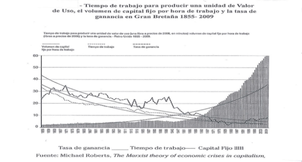 Punto 1. El desarrollo de las fuerzas productivas no se acompaña de un proporcional aumento del valor y de la plusvalía, que son los componentes básicos del capital. Antes bien, el valor decae y la plusvalía comienza a ponerse en peligro en esta fase del capitalismo.