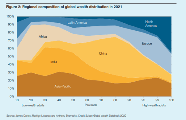 El aumento general de la riqueza mundial refleja principalmente el aumento de la riqueza en China y en la expansión de la «clase media» en el llamado mundo en vías de desarrollo. Aun así, la riqueza promedio de este grupo es de 33.724 dólares, o solo alrededor del 40 % del nivel de riqueza promedio en todo el mundo. La mayoría de las personas ricas y muy ricas todavía viven en el llamado «Norte Global». Pero tenga en cuenta que el 7 % de las personas más pobres del mundo viven en América del Norte.