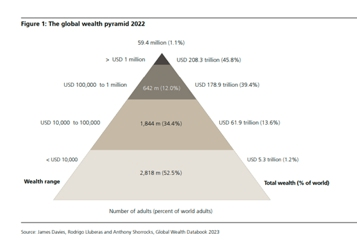 El Informe Mundial de Desigualdad (WIR) muestra que el mundo se ha vuelto más desigual en riqueza en los últimos 40 años. En 2021, «después de tres décadas de globalización comercial y financiera, las desigualdades globales siguen siendo extremadamente pronunciadas… casi tan grandes hoy como lo fueron en el apogeo del imperialismo occidental a principios del siglo XX». La concentración global de la riqueza personal es extrema. Según el WIR, el 10 % más rico de los adultos del mundo posee alrededor del 60-80% de la riqueza, mientras que la mitad más pobre tiene menos del 5 %. Según el informe de riqueza global de UBS, el 1 % de todos los adultos en el mundo posee el 44,5 % de toda la riqueza personal, mientras que más del 52 % solo tiene el 1,2 %. El 1 % es de 59 millones, mientras que el 52 % es de 2,9 mil millones.