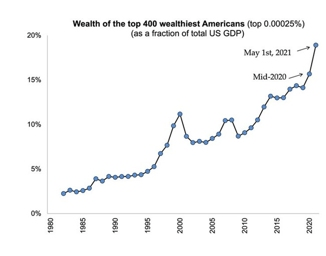 En el siglo XXI, la desigualdad de riqueza ha aumentado significativamente. De hecho, la riqueza de las 50 personas más ricas de la tierra aumentó un 9 % al año entre 1995 y 2021, y la riqueza de las 500 personas más ricas aumentó un 7 % al año. La riqueza promedio creció menos de la mitad de esa tasa, con un 3,2 % durante el mismo período. Desde 1995, el 1 % superior se apropió del 38 % de toda la riqueza global adicional en los últimos 25 años, mientras que el 50 % inferior obtuvo solo el 2 % de ella. El aumento del llamado grupo de ingresos de clase media en el siguiente gráfico se debe principalmente a la reducción de los niveles de pobreza en China. El 0,01 % superior de los adultos aumentó su participación en la riqueza personal del 7,5 % en 1995 al 11 % ahora. Y la población multimillonaria aumentó su participación del 1 % al 3,5 %.