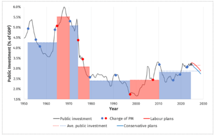 Un estudio reciente de la London School of Economics pide un aumento de la inversión pública del 1 % pt del PIB, es decir, un aumento de 26.000 millones de libras esterlinas al año a los precios actuales. Pero, ¿qué proponen Rachel Reeves y el Partido Laborista? Planean un aumento de solo 7.300 millones de libras esterlinas «en el transcurso del próximo Parlamento», a través de un Fondo Nacional de Riqueza «que haga inversiones transformadoras en todo el país«. El partido laborista liderado por Corbyn propuso 25 mil millones de libras esterlinas; pero el liderazgo de Reeves-Starmer propone solo una cuarta parte de eso y una fracción de lo que incluso los economistas de la LSE consideran que se necesita. De hecho, lo que se necesita para una transformación adecuada de la industria y los servicios públicos son unos 60.000 millones de libras esterlinas al año durante los próximos cinco años, o un aumento de al menos 2-3 % pts del PIB cada año. ¡En cambio, el plan laborista en realidad implica una caída de la inversión pública en el PIB durante esta legislatura!