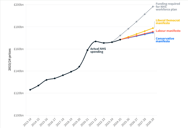 De hecho, el Nuffield Trust considera que los planes de gasto actuales del nuevo gobierno laborista para el NHS significarán un nuevo período de austeridad. El crecimiento anual del gasto total en salud del 0,8 % daría lugar a que los próximos cuatro años sean los más ajustados financieramente en la historia del NHS con las promesas laboristas, incluso más estricto que el período de «austeridad» del antiguo gobierno de coalición conservador, que vio crecer la financiación en solo un 1,4 % en términos reales al año entre 2010/11 y 2014/15.