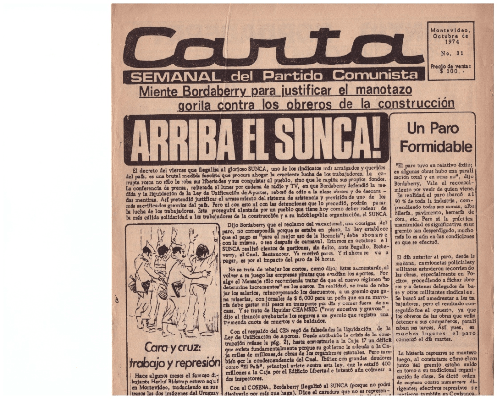 El semanario clandestino que circulaba por distintos lugares de trabajo y barrios, mano en mano, titulaba en tapa: ARRIBA EL SUNCA! Por encima un colgado que dice:”Miente Bordaberry para justificar el manotazo gorila contra los obreros de la construcción” Y a un costado una columna con el título de: “Un Paro Formidable