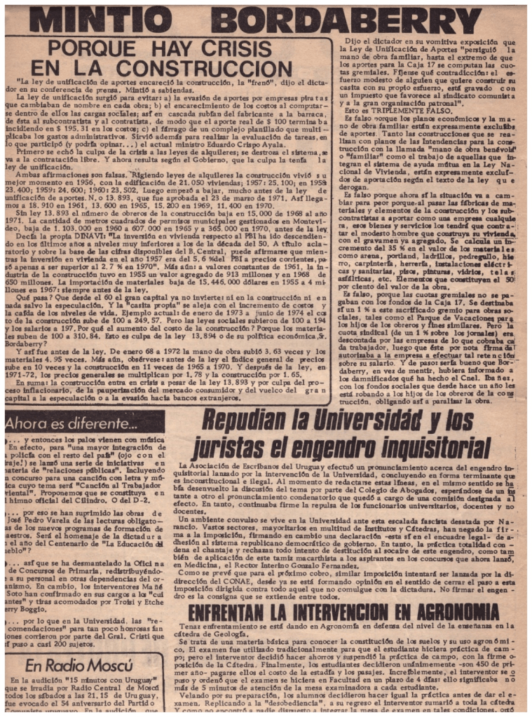 Pasemos a leer el texto: “El decreto del viernes que ilegaliza al glorioso SUNCA, uno de los sindicatos más arraigados y queridos del país, es una brutal medida fascista que procura ahogar la creciente lucha de los trabajadores. La corrupta rosca no sólo le roba sus libertades y sus conquistas al pueblo, sino que le rapiña sus propios fondos. La conferencia de prensa, reiterada el lunes por cadena de radio y TV, en que Bordaberry defendió la medida y la liquidación de la Ley de Unificación de Aportes, rebosó de odio a la clase obrera y de descaradas mentiras. Así pretendió justificar el arrasamiento del sistema de asistencia y previsión de uno de los más sacrificados gremios del país. Pero ni con esto ni con las detenciones que lo precedió, podrán parar la lucha de los trabajadores. Ésta proseguirá alentada por un pueblo que tiene hoy como deber rodear de la más cálida solidaridad a los trabajadores de la construcción y a su indoblegable organización, el SUNCA.