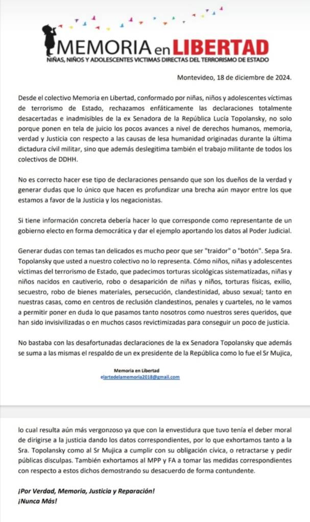 El Colectivo conformado por niñas, niños y adolescentes víctimas del terrorismo de Estado rechazan las declaraciones de la Sra. Topolansky, ex Vicepresidenta y ex Senadora de la República, afirmando que ex presos políticos han mentido a la justicia.