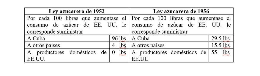 Tabla 1: Comparación de las leyes azucareras de 1952 y 1956
