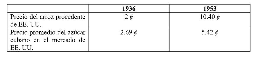 Tabla 2. Comparación de precios del arroz estadounidense y el azúcar cubana