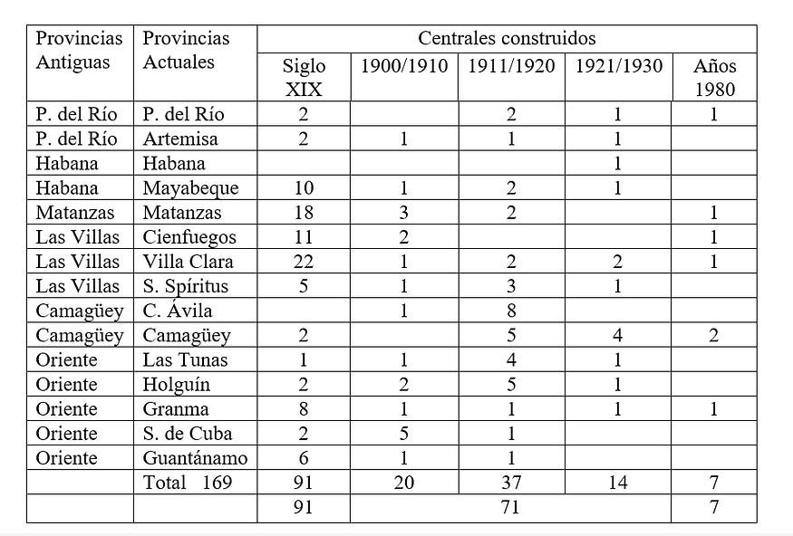 En la tabla 4, confeccionada a partir del Anexo: Centrales azucareros de Cuba de la wikipedia cubana EcuRed, puede observarse que de 169 centrales azucareros compendiados, el 42 % (71 centrales) se construyeron en el primer cuarto del siglo XX, una impresionante cifra si se considera que Cuba ya venía de ser el mayor productor de azúcar del mundo durante casi todo el siglo XIX; correspondieron a Camagüey y Oriente el 60 % (43 centrales) de todos los nuevos centrales construidos, entre ellos los más grandes de Cuba y el mundo.