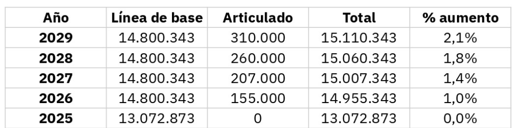 Tabla elaborada por la Cooperativa Comuna. Los montos son en miles de pesos; la línea de base es el dinero actual del MVOT y el articulado son los incrementos en el proyecto de Presupuesto 2025-2029.