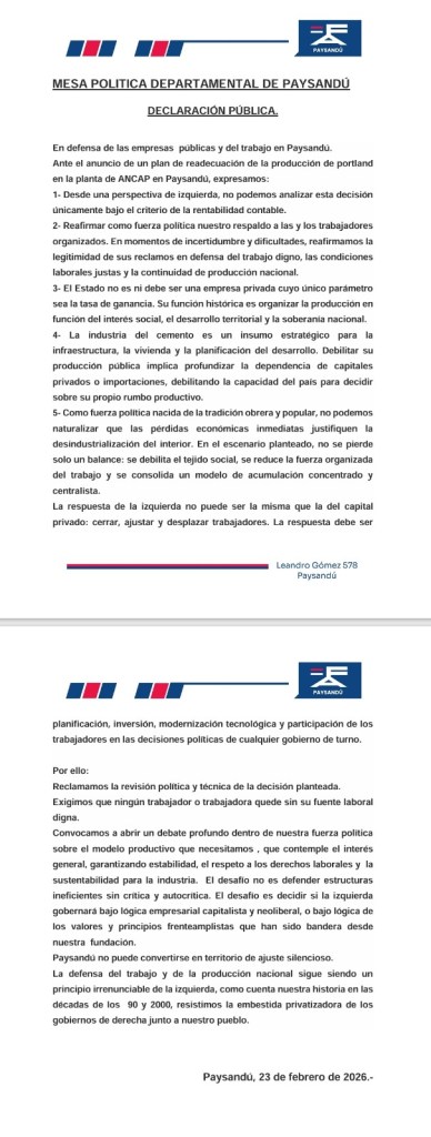 La Mesa Política Departamental de Paysandú del Frente Amplio emitió declaración pública en la que expresa su rechazo al plan de readecuación de la producción de portland en la planta local de ANCAP, y reclama que ningún trabajador o trabajadora pierda su fuente laboral.