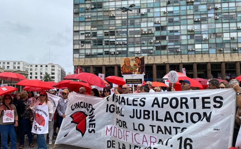 El grupo Cincuentones estuvo muy activo en 2016, realizó movilizaciones, concentraciones, marchas y tras una lucha muy fuerte logró la aprobación de la ley N.19.590 que permitía a todos los que entraron a las AFAPS obligados por la edad en su momento, salir del régimen mixto y volver al sistema público de jubilación en el BPS. “Todos lo vimos con muy buenos ojos, pero en 2017 se generó un debate político muy fuerte hasta octubre de ese año en torno a este proyecto, que en su origen no implicaba ningún descuento en la jubilación y en diciembre informan de parte del gobierno que le van a introducir modificaciones”, recordó. Por iniciativa del Ministerio de Economía de aquel momento, dirigido por Danilo Astori, se le agrega a la Ley el artículo 16 que establecía que a la resultante del cálculo jubilatorio se lo debería multiplicar por el coeficiente 0.9. “Eso quiere decir que a nuestra asignación inicial de jubilación se le hacía una quita de 10% que se traslada a toda la vida porque “calculan cuánto tendrías que cobrar de jubilación contando 20 años pero después a ese resultado final le quitan ese porcentaje.” Acotó que esta modificación fue conocida, estuvo en todos los medios de prensa, y se aprobó con fines exclusivamente fiscales, sin ningún argumento lógico o de peso. Además la intención inicial del equipo del Ministro Astori era que la quita fuera de un 20%, después hubo acuerdos entre los sectores del Frente Amplio, y quedó en un 10%.