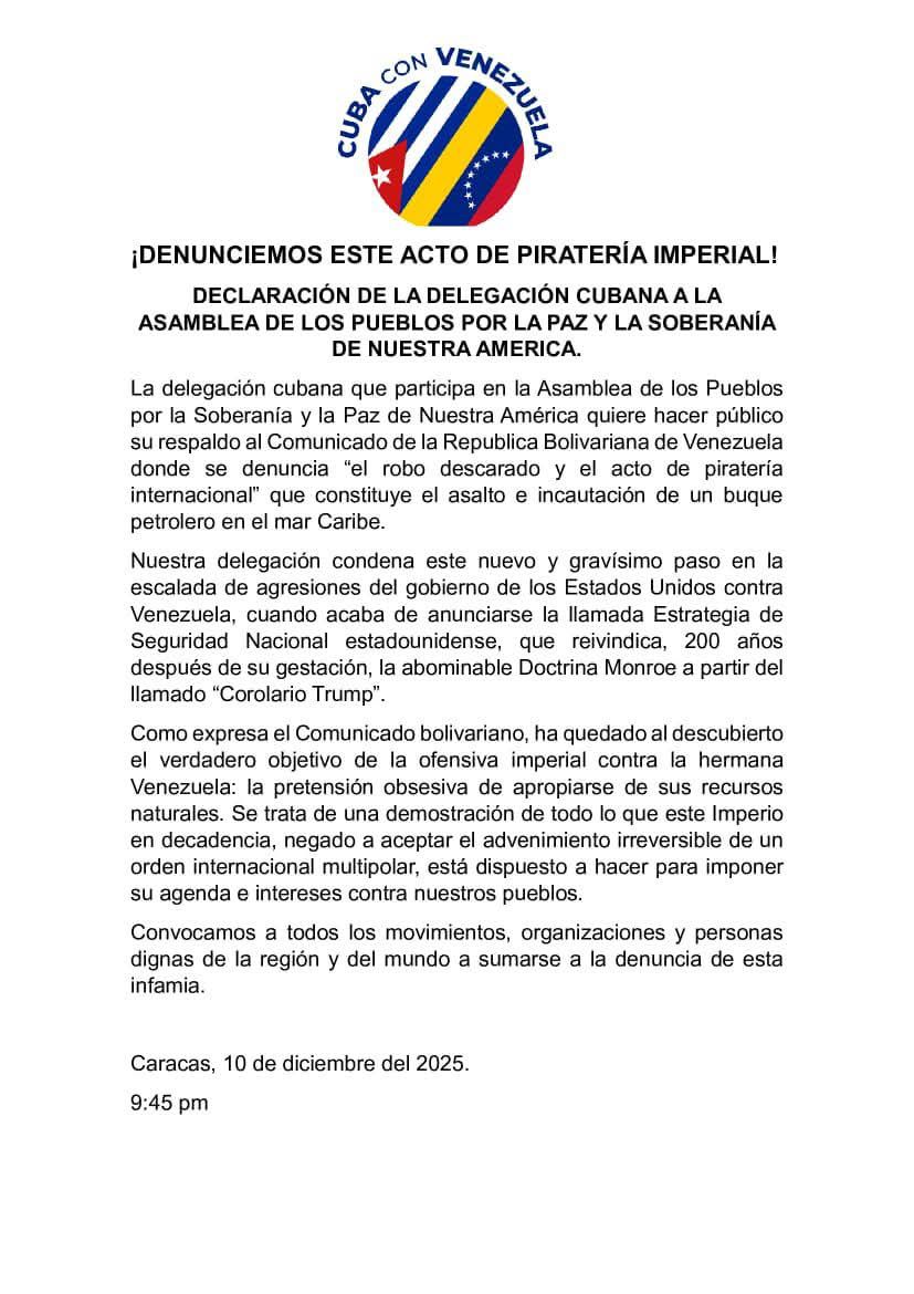 La delegación cubana que participa en la Asamblea de los Pueblos por la Soberanía y la Paz de Nuestra América, denuncia y condena “el robo descarado y el acto de piratería internacional” del asalto e incautación de un buque petrolero en el mar Caribe.
